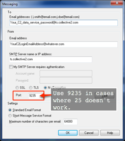 If port 25 doesn't work for you, new versions of TradeStation (version 9.1 and higher) allow you to specify an alternate port. We support port 9235 as well. You can enter that in the Port field as shown below. (Again, this is only needed in cases where your ISP blocks regular port 25 access.)