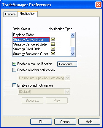 To make the envelope appear, find the Notification Type (for example, "Strategy Active Order"), click it with your mouse to highlight it, then check the box called Enable e-mail notification.