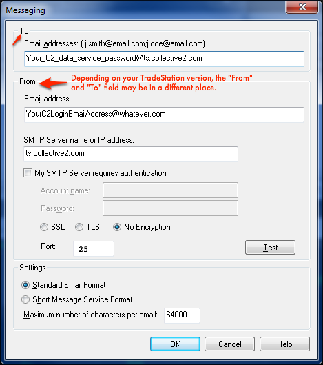 For most people, you will not need to download or run any "helper application" on your computer. Instead, you will tell TradeStation to send an email to C2 each time a signal is generated, and C2 will capture that attempt to send an email, and turn it into a C2 signal. Note, however, that some Internet Service Providers (ISPs) will block attempts to use outside mail servers (which is what C2's signal-capture technology looks like, to the ISP). In these cases, you will need to run a helper application on your computer. More on this later, in the "Troubleshooting" section. For now, try setting up your TradeStation using the simple steps described below.